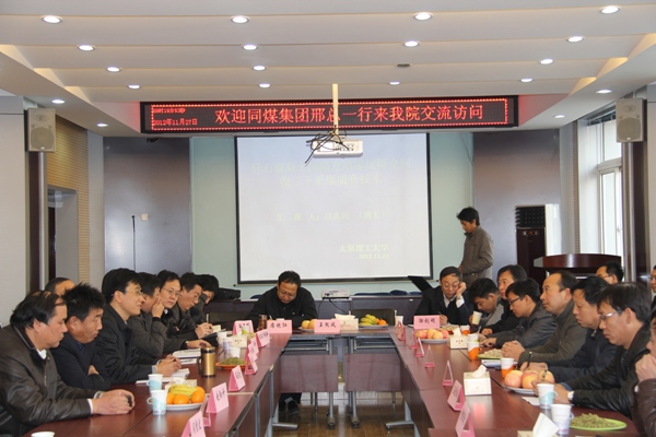 实验室考察后,院党委书记薛武杰、院长梁卫国教授、各系负责人及相关学科带头人与同煤集团来宾在采矿楼二层学术会议室进行了座谈交流。交流期间,就同煤集团所属矿井生产过程中遇到的各种技术难题双方展开了深入的讨论,内容涉及三下采煤、巷道支护、顶板控制、瓦斯抽采、地表沉陷及矿山地质灾害等领域,尤其对“矸石混凝土间隔充填零沉降全回收三下采煤”成套技术进行了详细研讨。