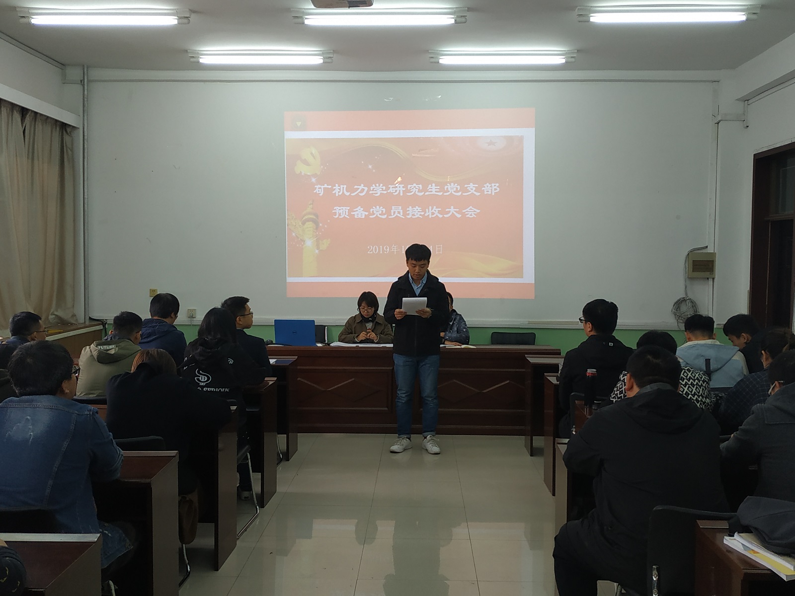 2019年10月24日中午,矿机力学研究生党支部在致明楼208召开接收预备党员大会。矿机力学研究生党支部全体党员参加了会议,会议由党支部书记刘安主持。
